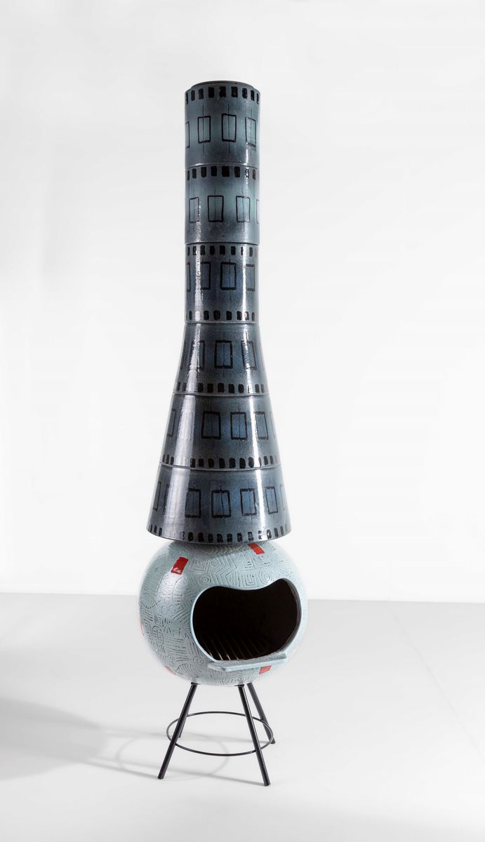 Camino con struttura in ceramica smaltata e sostegni in metallo.