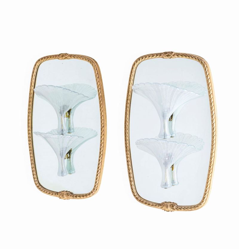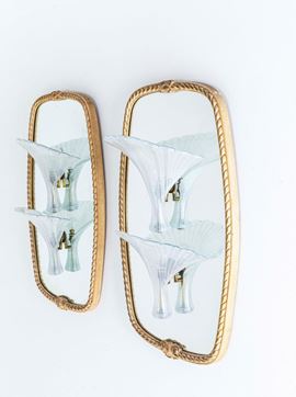 Due specchi luminosi con struttura e cornice in legno lavorato. Dettagli in ottone. Appliques in rilievo in vetro di Murano.
