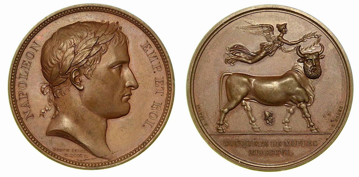Testa laureata a d. di Napoleone. R/ Nel campo un toro androcefalo incoronato da una Vittoria. Fra le gambe del toro, testa di Vulcano. Opus J. B. Andrieu e A. Brenet. Julius 1557. Essling 1129. Bramsen 516. diam. mm. 40. SPL/q.FDC