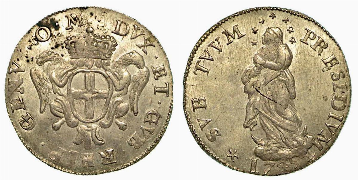 Stemma coronato sorretto da due grifoni. R/ La Beata Vergine su crescente e nubi; sotto, 1745. CNI 2. Lunardi 333. MIR 323/1. Arg. g. 4,55. SPL