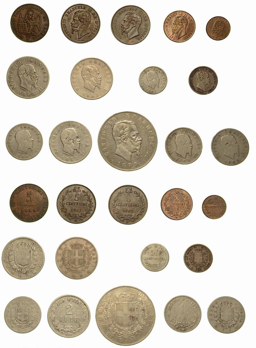 Governo Provissiorio di Venezia. 5 Centesimi 1849. Vittorio Emanuele II di Savoia (Regno di Sardegna), 1849-1861. 50 Centesimi 1860. Vittorio Emanuele II di Savoia (Regno d'Italia), 1861-1878. 5 Lire 1875. 2 Lire 1863 N (x 2 esemplari) - 1863 T. 1 Lira (x 3 esemplari) 1863 M. 50 Centesimi 1863. 5 Centesimi 1861 M - 1862 N. 2 Centesimi 1867 M. 1 Centesimo 1867. Conservazioni da B/MB a BB/SPL.