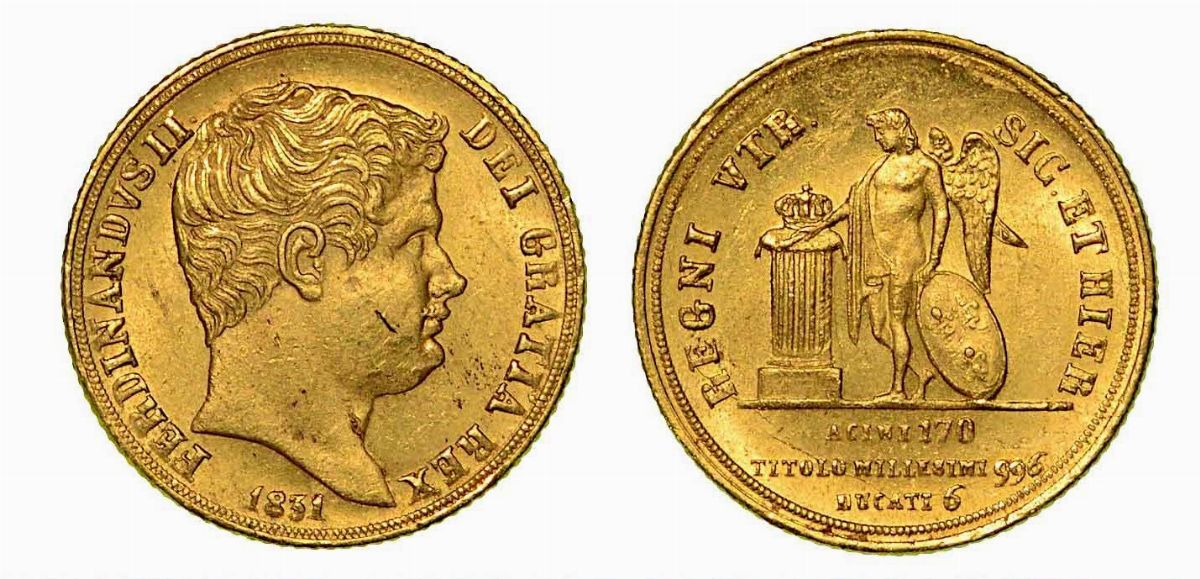 Testa a d. R/ Il Genio borbonico stante a s. posa la mano d. su una colonna coronata. Gig. 26. Oro. g. 7,57. q.SPL