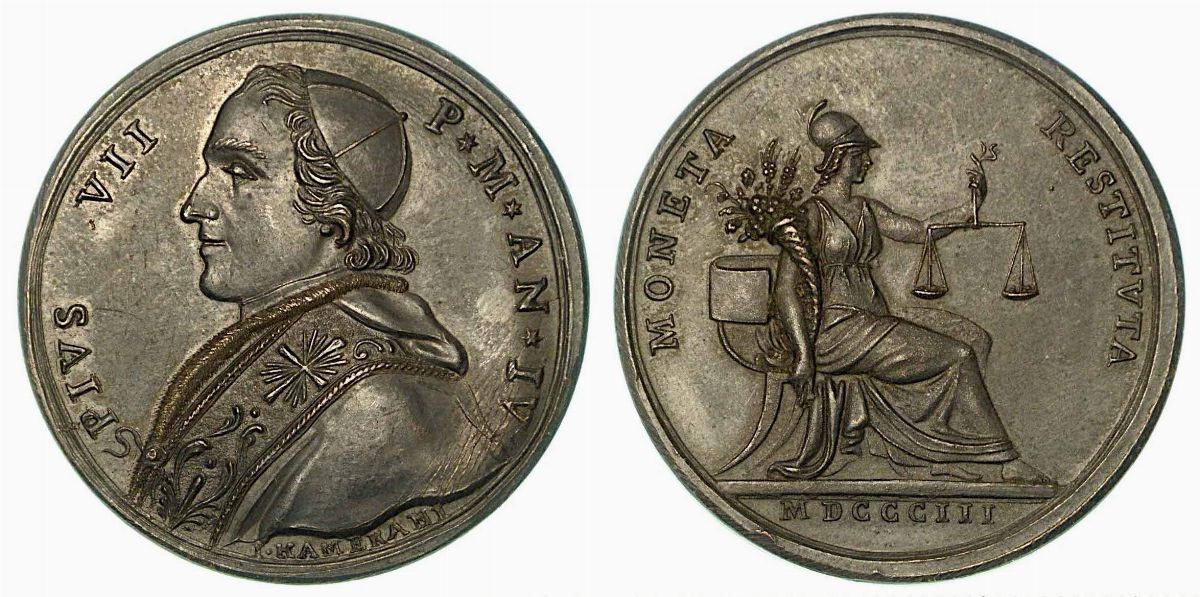 Busto del Pontefice a s. R/ MONETA RESTITVTA La Giustizia seduta tiene una cornucopia simbolo dell'Abbondanza nella mano destra ed una bilancia simbolo della Giustizia nella sinistra, in esergo MDCCCIII. Opus Giovanni Hamerani. diam. mm. 38. SPL