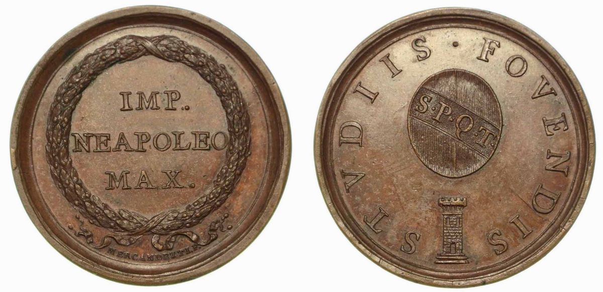 Legenda in tre righe entro corona di foglie di quercia. R/ In ovale, scudo con S•P•Q•T• (Senatus Populusque Tifernatis), in basso, torre. Opus Mercandetti. Bramsen 1069. Julius 2395. Turr.749. diam mm. 39. q.FDC