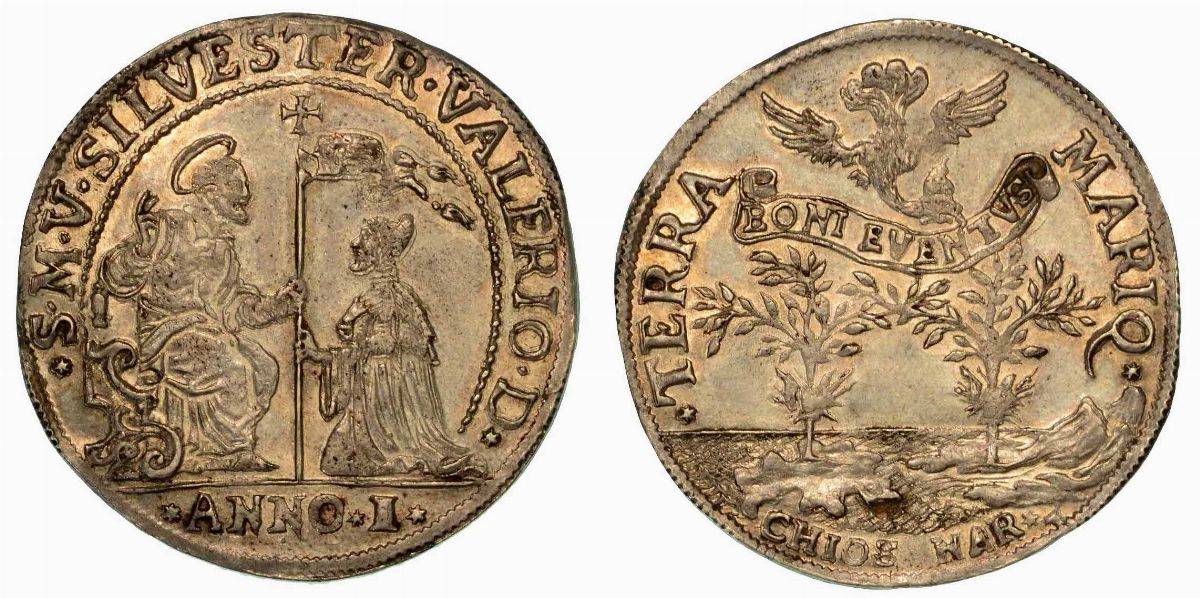 San Marco, seduto, consegna il vessillo al Doge, genuflesso. R/ Due piante di lauro sopra le quali un'aquila coronata, in volo, con nastro nel becco. CNI 119. Paolucci 177. Arg. g. 9,86. SPL/FDC