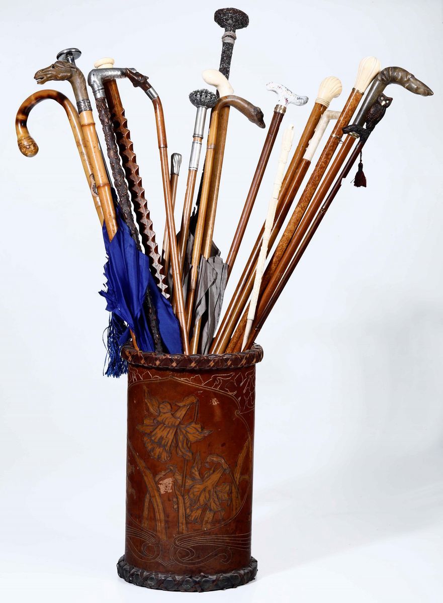 Vaso da terra italiano liberty in cuoio marrone, inciso ai piccoli ferri a motivi floreali, dorature, contenente una collezione di 14 bastoni da passeggio