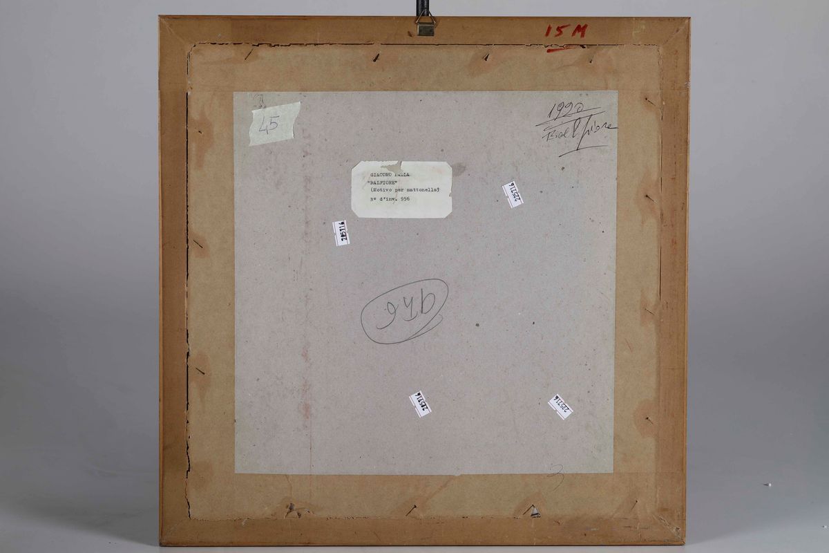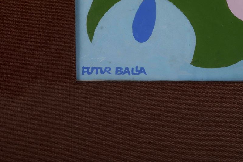 Autentica del prof. Fabio Benzi su fotografia; si ringrazia la dott.ssa Elena Gigli per aver confermato oralmente l’autenticità dell’opera; autentica di Luce Balla su fotografia. Al retro etichetta di Casa Balla “GIACOMO BALLA/“BALFIORE” (Motivo per mattonella)/N° inv. 956” e scritte posteriori. Autentica di Luce Balla su fotografia; autentica del prof. Fabio Benzi del 17/11/2017 che data l’opera al 1925 ca