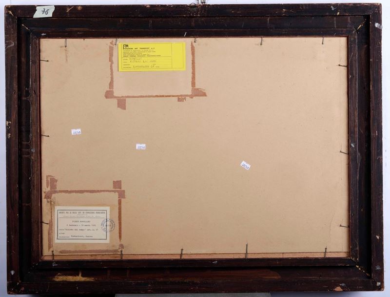 Bibl.: - Plinio Nomellini, a cura di Gianfranco Bruno, catalogo della mostra, Milano, Palazzo della Società per le Belle Arti ed Esposizione Permanente, [6] febbraio – [10] marzo 1985, Genova 1985, cat. n. 97 - G. Bruno, Plinio Nomellini, Genova 1994, ill. p. 38 Plinio Nomellini si trasferì a Firenze nel 1919, in un’abitazione a Poggio Imperiale. A partire da quella data il segno colorato della sua pennellata stravolge i soggetti e le sue composizioni fondono in un tutt’uno figure e movimento. Così in quest’acquarello, come in molte opere riferibili agli anni ’20, la celebrazione del rapporto con la terra si trasforma in un’onda il cui dinamismo avvolge uomini e paesaggio.