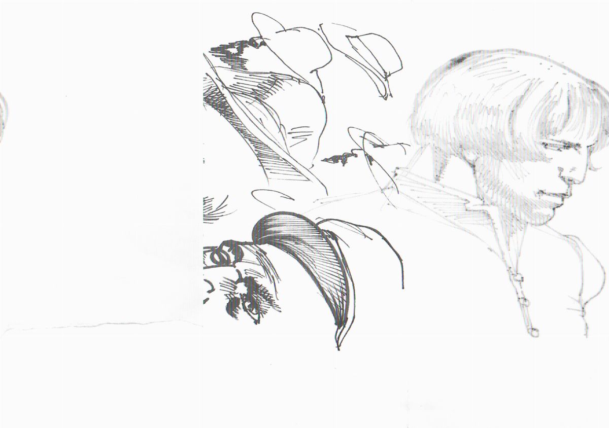 Coppia di illustrazioni composta da un’illustrazione matita su carta. Cm 33x21.5, firmata con monogramma e uno studio di personaggi, matita e china su carta fronte e retro. Cm 21x30. Assenza al margine bianco inferiore sinistro, opera intatta.
