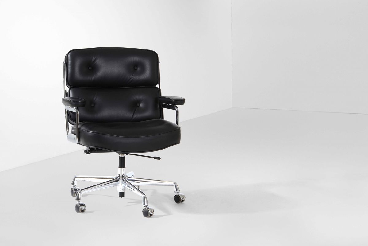 Poltrona girevole con struttura in metallo cromato e rivestimenti in pelle.