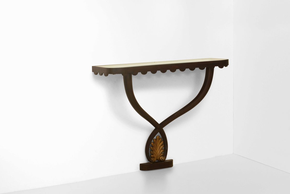 Consolle da parete con struttura in legno e piano in cristallo specchiato.