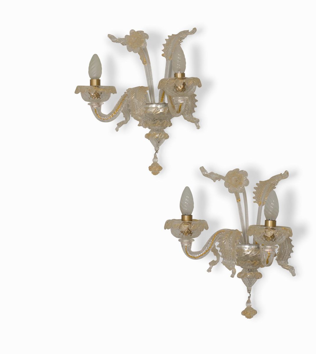Coppia di lampada da parete in vetro di Murano a foglia oro e particolari in ottone.