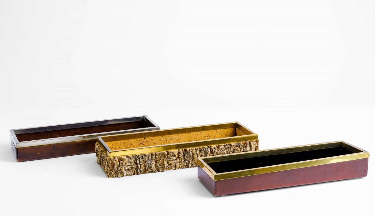 Set di tre scatole portaoggetti in cuoio e sughero con profili in ottone e acciaio.