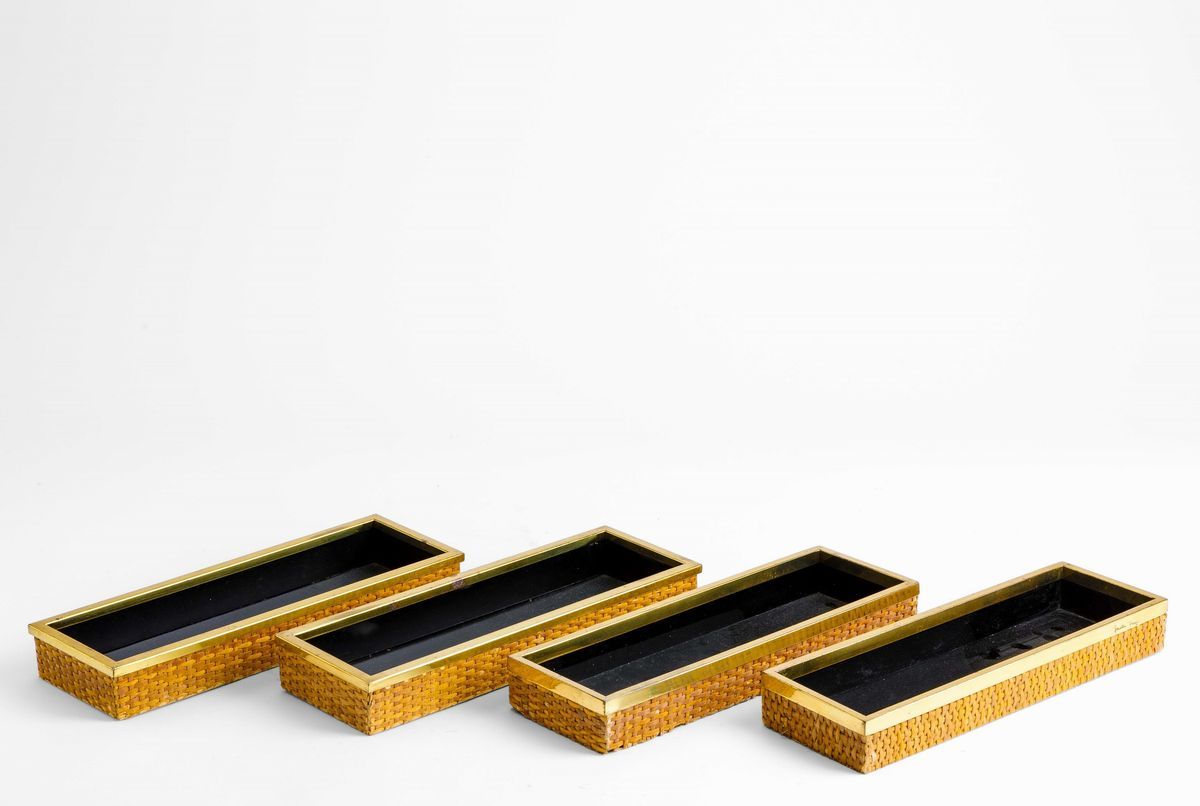 Set di quattro scatole porta oggetti in rattan e profili in ottone.