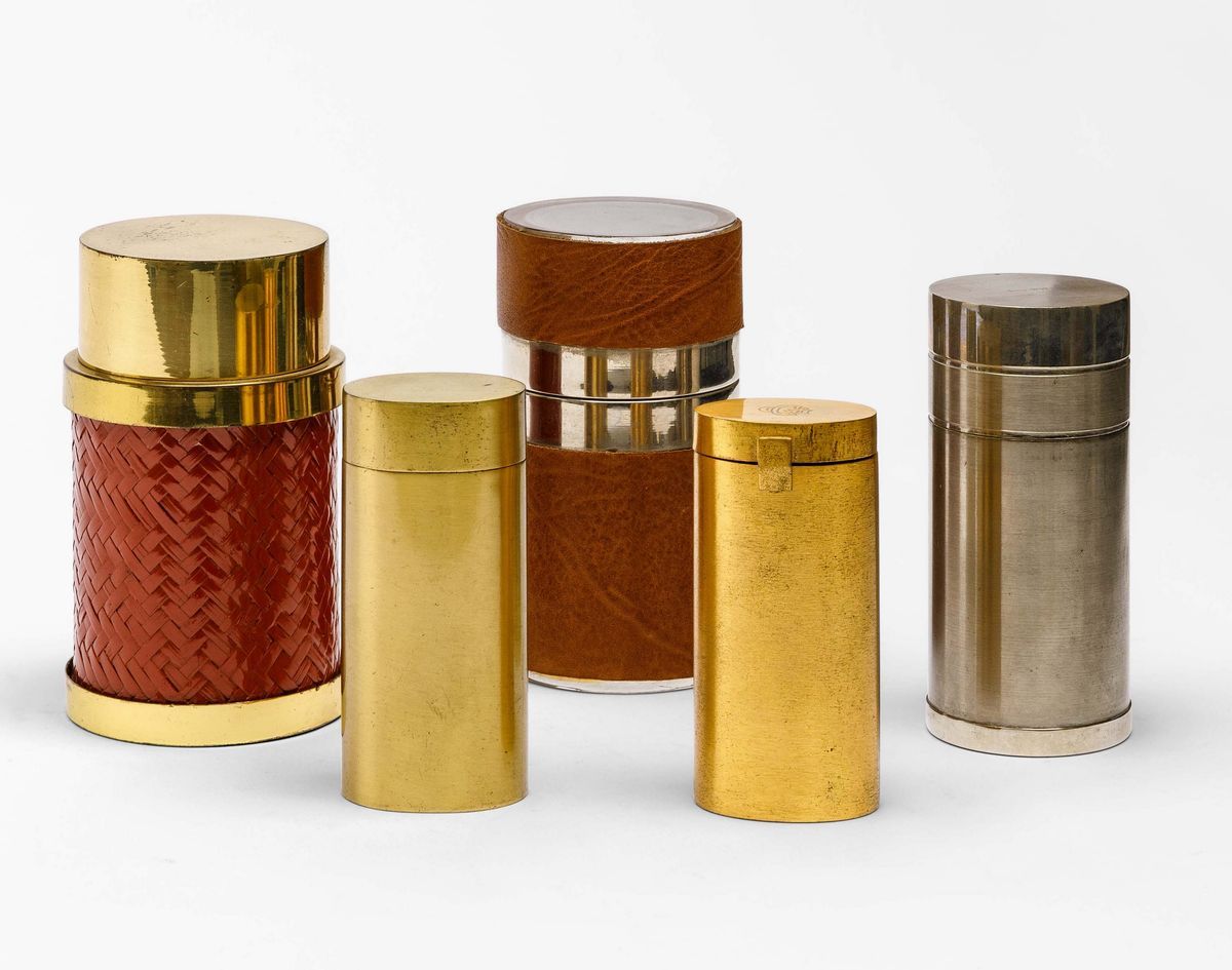 Set di cinque scatole in diversi materiali. Strutture in ottone, legno e metallo nichelato. Rivestimenti in bamboo.