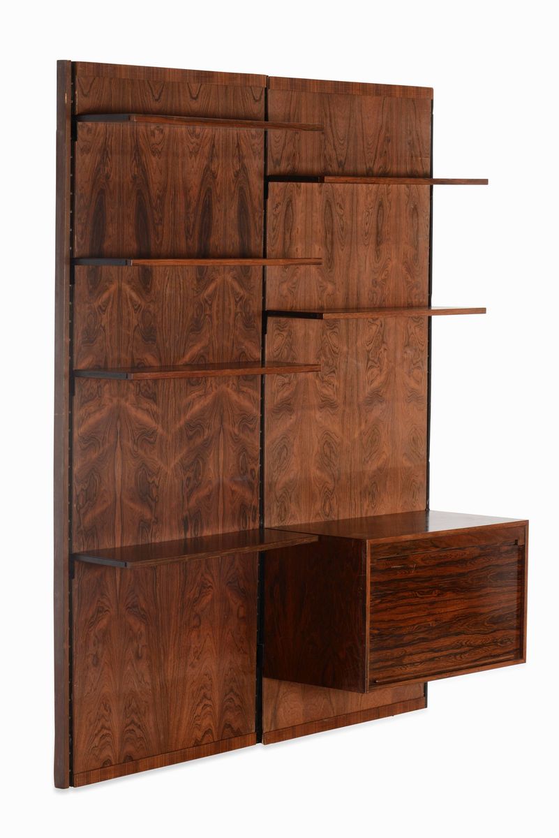Libreria con struttura in legno e metallo, piani ad altezza regolabile e mobile contenitore a serrandina.