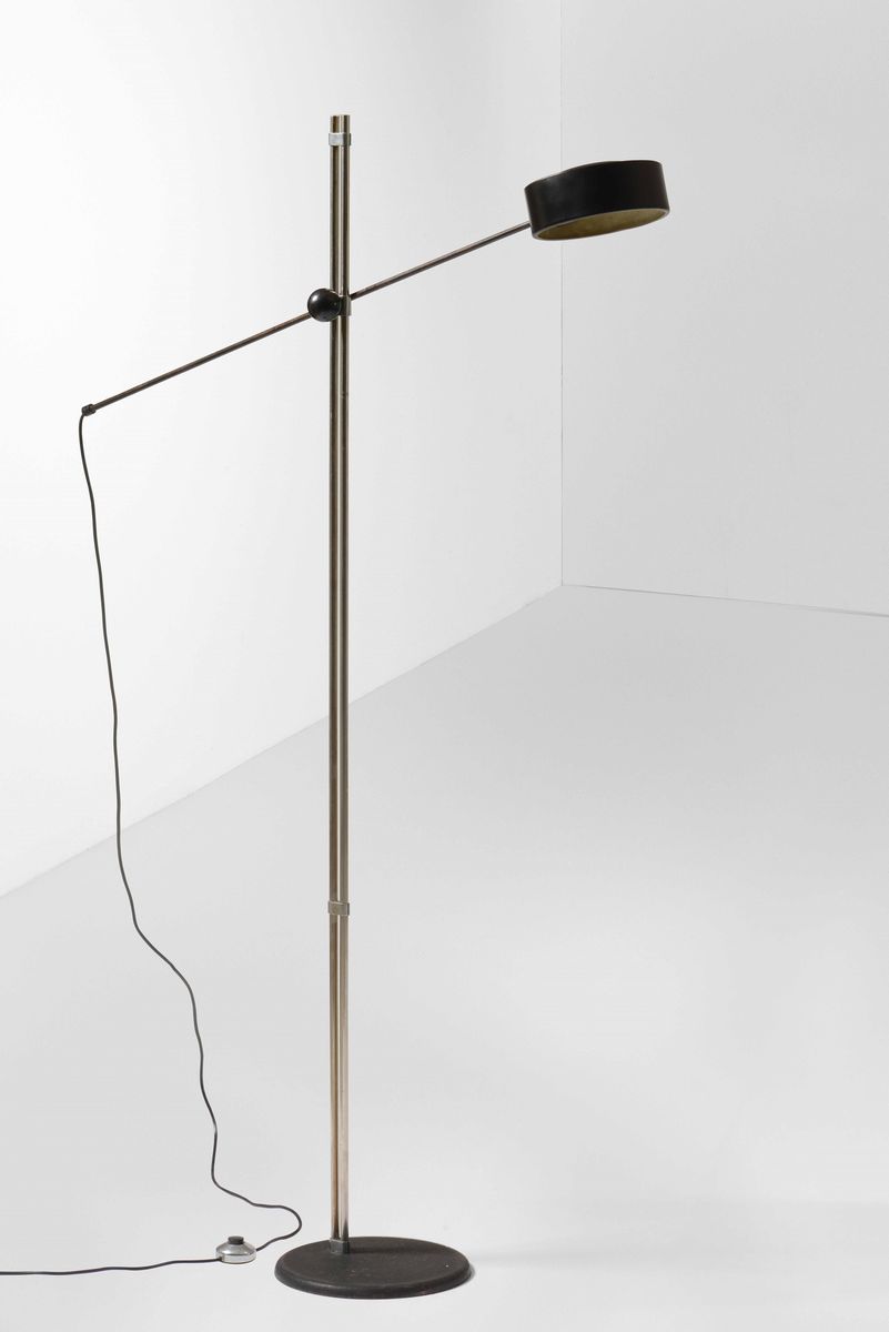 Lampada da terra orientabile con struttura in metallo cromato, diffusore e base in metallo laccato.