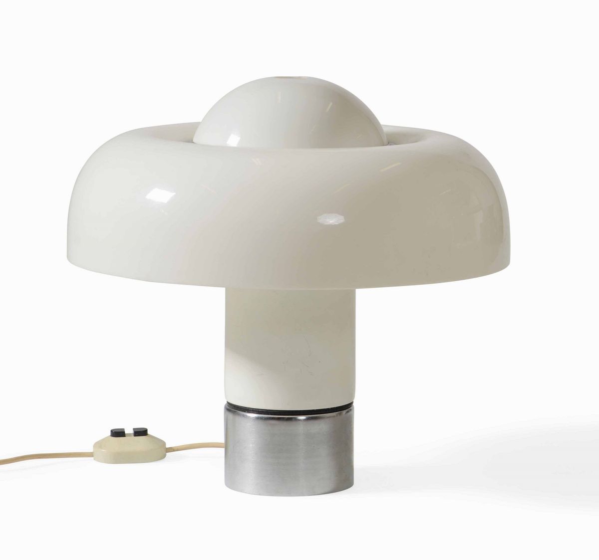 Lampada da tavolo mod. Brumbry in metallo laccato e cromato, diffusore in metacrilato termoformato.