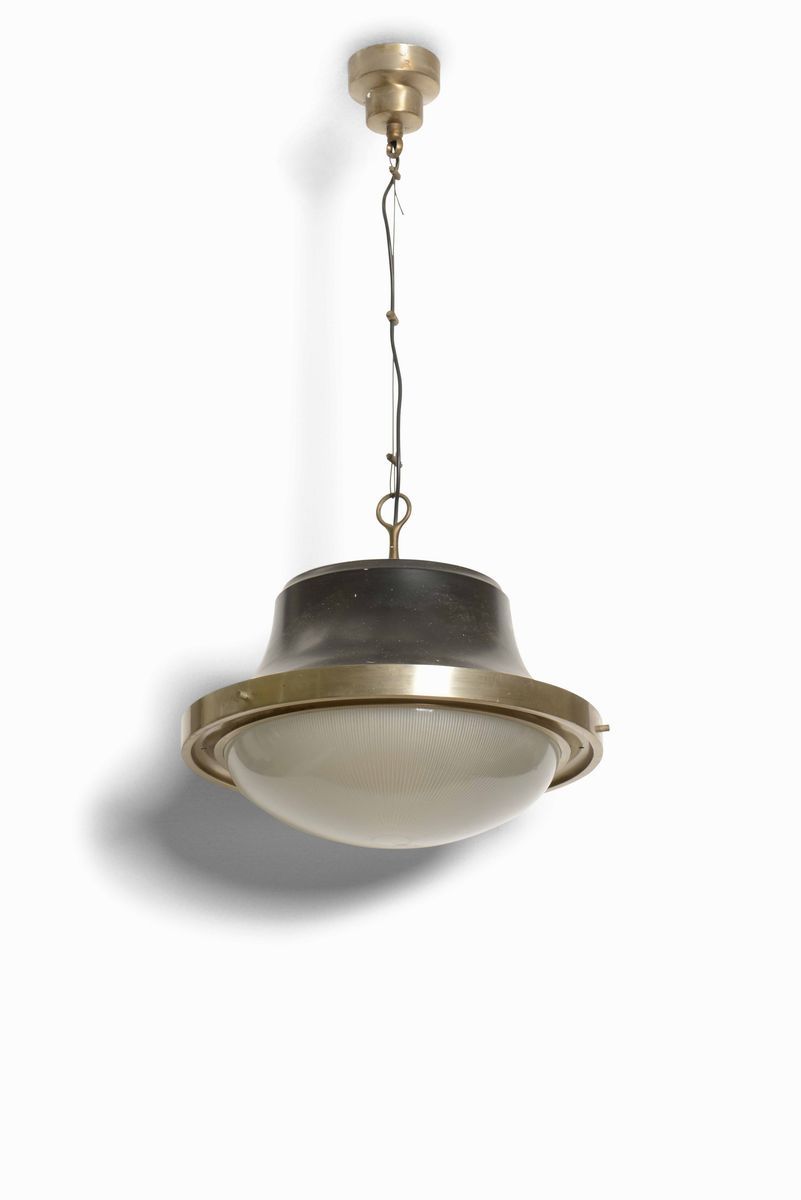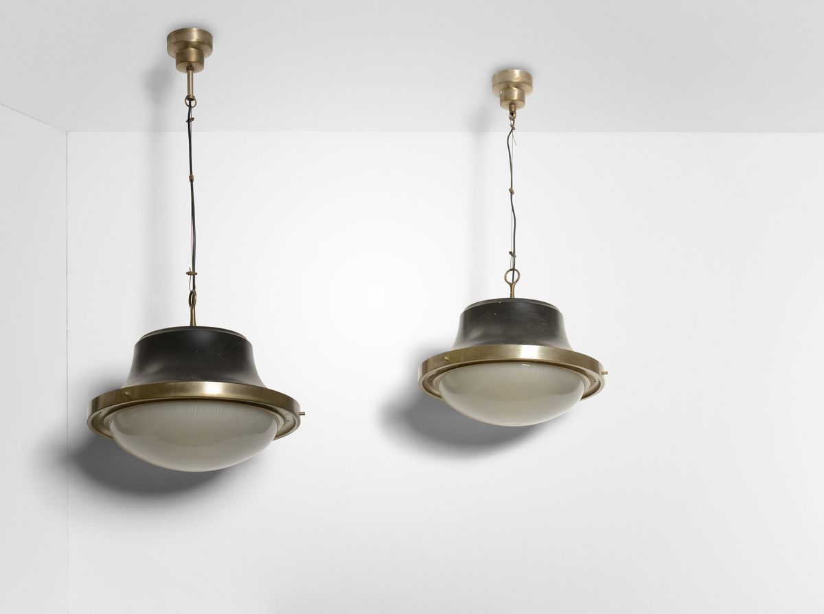 Coppia di lampade a sospensione mod. Tau in metallo e diffusore in vetro stampato.