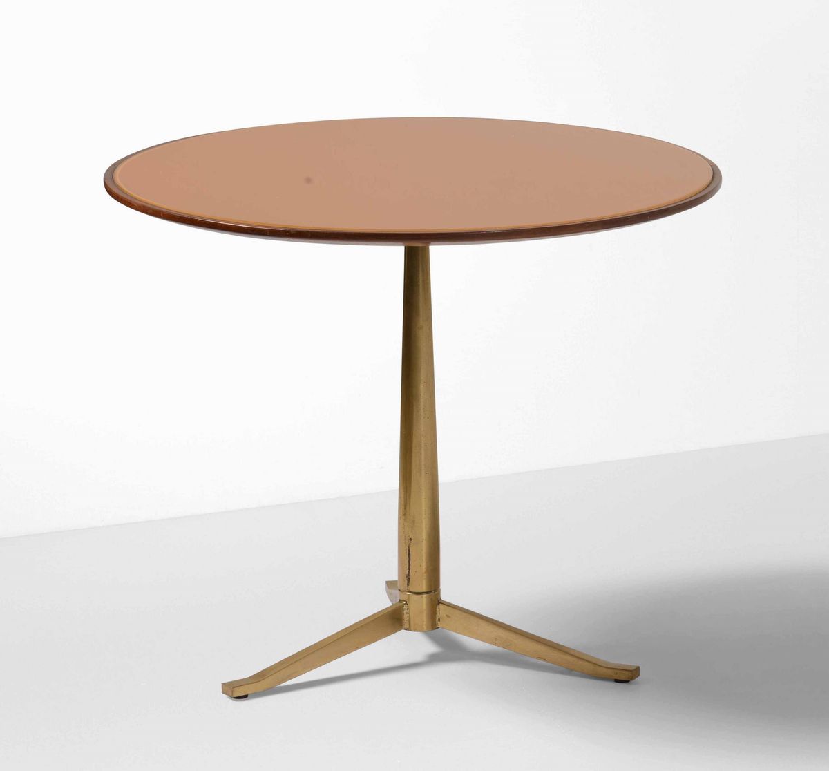Tavolo basso con struttura in ottone e piano in vetro colorato.