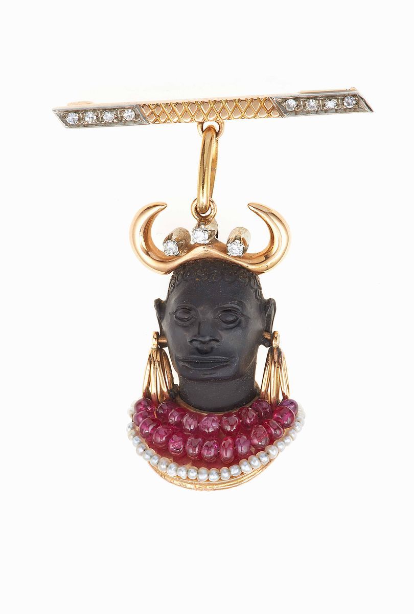 Spilla moretto con rubini, diamanti e piccole perle