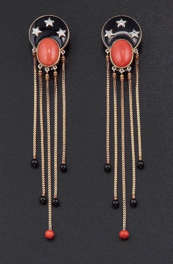 Anello ed orecchini con corallo, perle, onice, diamanti