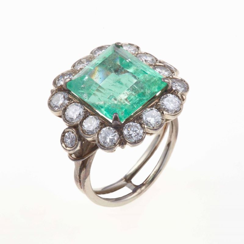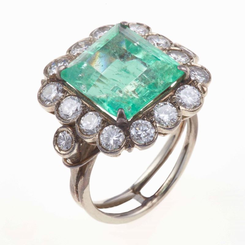 Anello con smeraldo Colombia di ct 8.00 circa e diamanti taglio brillante a contorno