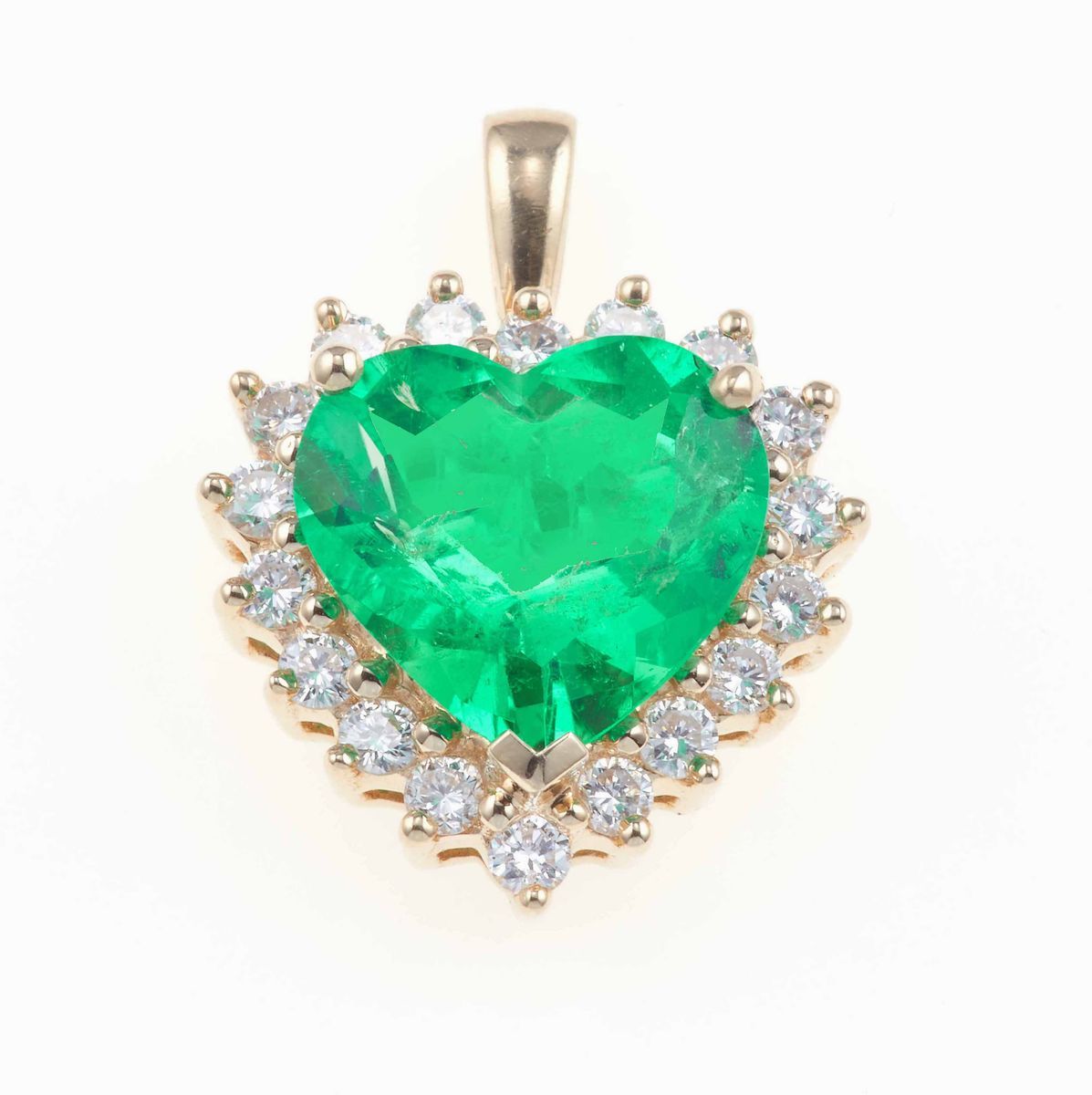 Pendente con smeraldo Colobia, taglio a cuore, di ct 4.40 e diamanti a contorno