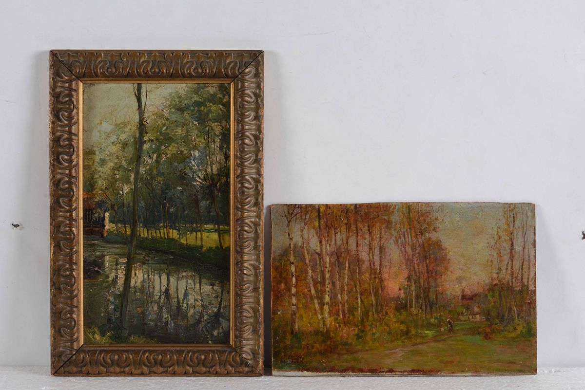 entrambi su cartone, Alberi lungo un fiume (cm 18x30) e Bosco di betulle (cm 19,5 x 30 ), firmato in b a dx