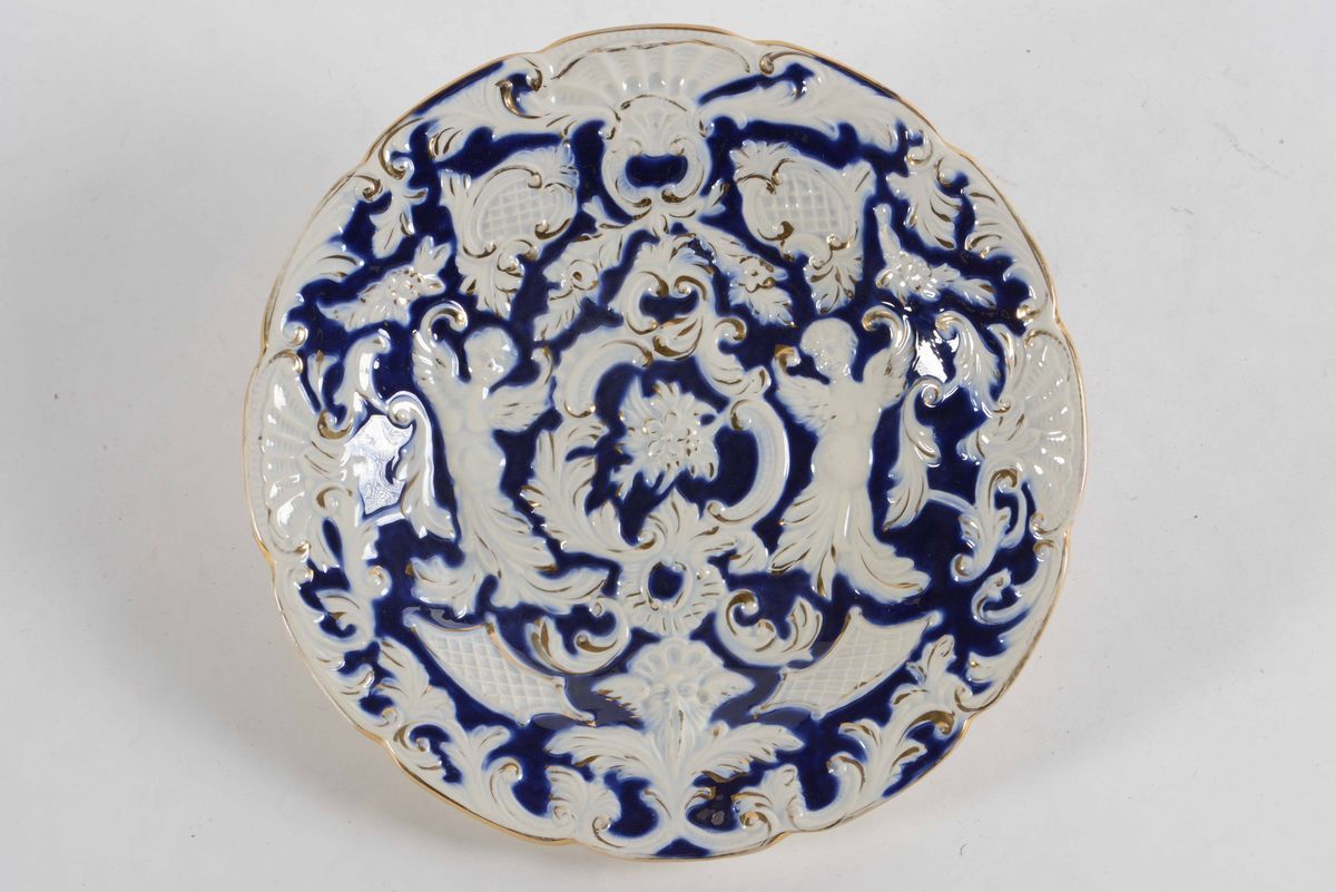 uno dipinto e dorato, diametro cm 24, l’altro con rilievi figurati in bianco, blu e oro diametro cm 29,7