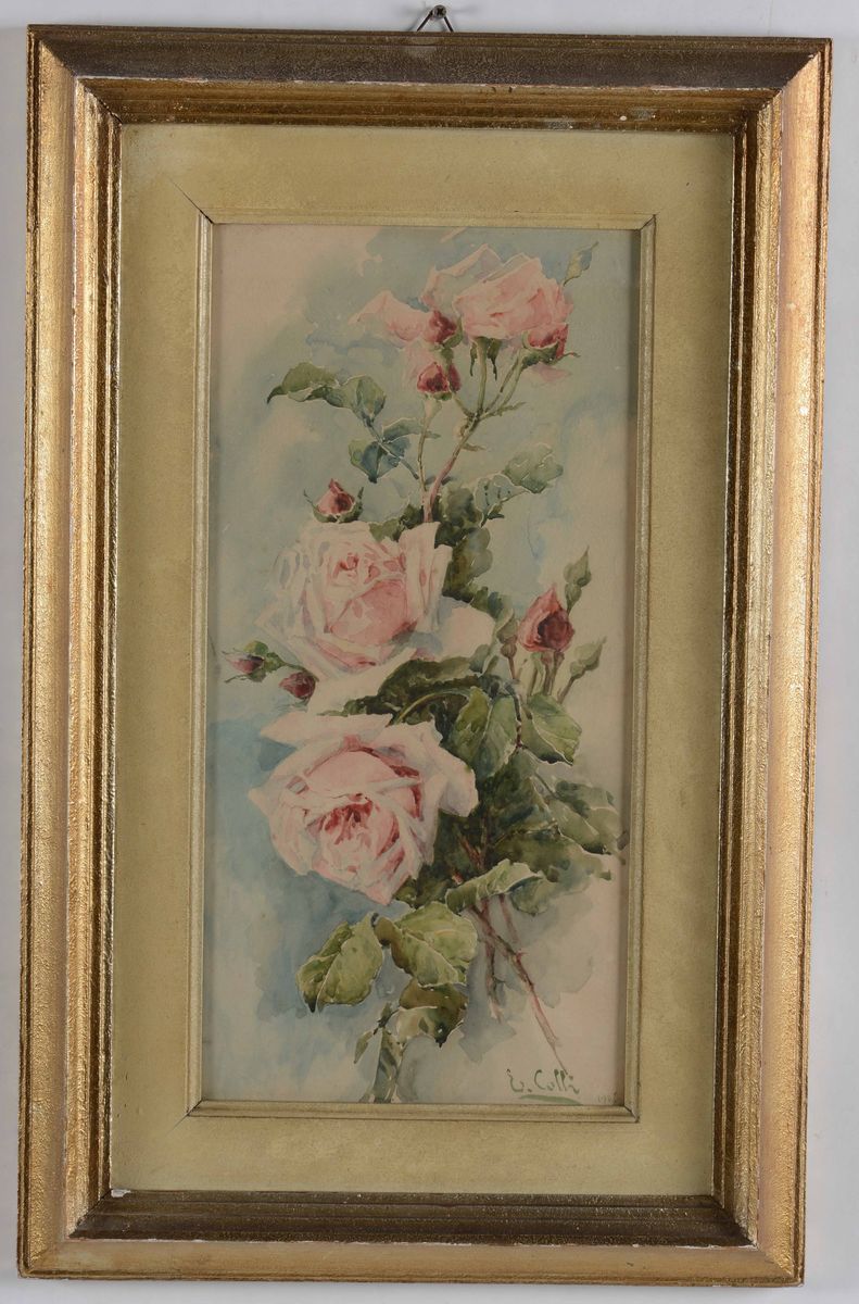 acquerello in cornice “Rose” firmato in b a dx e datato 1907; misure acquarello cm 23 x 48, cornice cm 43 x 67,5