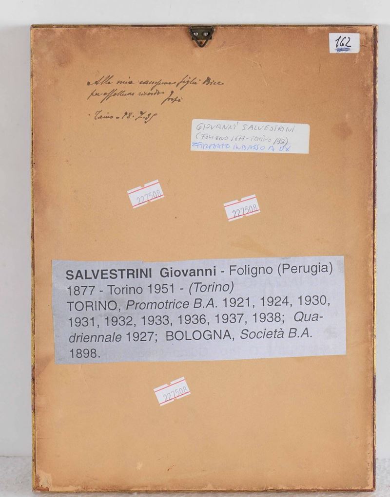 olio su cartone in cornice, firmato in b a dx e datato 12/5/32, con dedica sul retro alla figlia datata Torino, 28-7- 35. Misure, inclusa cornice cm 22 x 30
