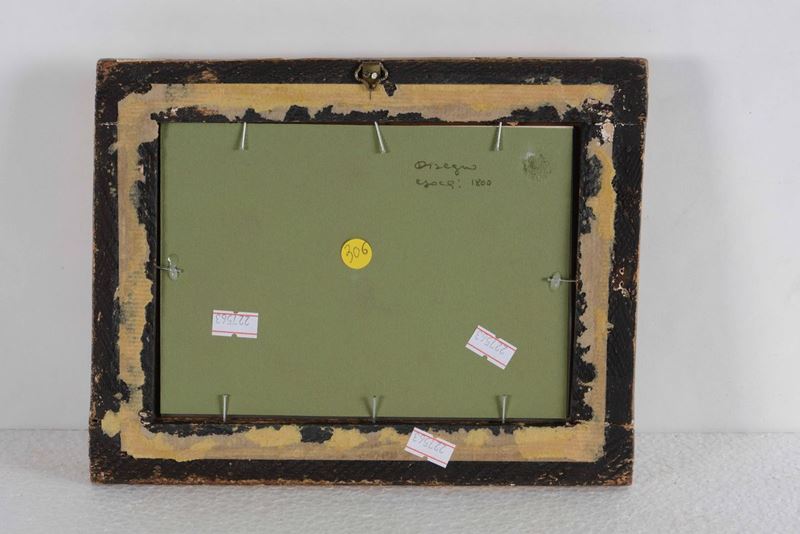 carboncino e acquarelli, entro cornice intagliata, dorata e graffita. Misure cornice: cm 19,7 x 25