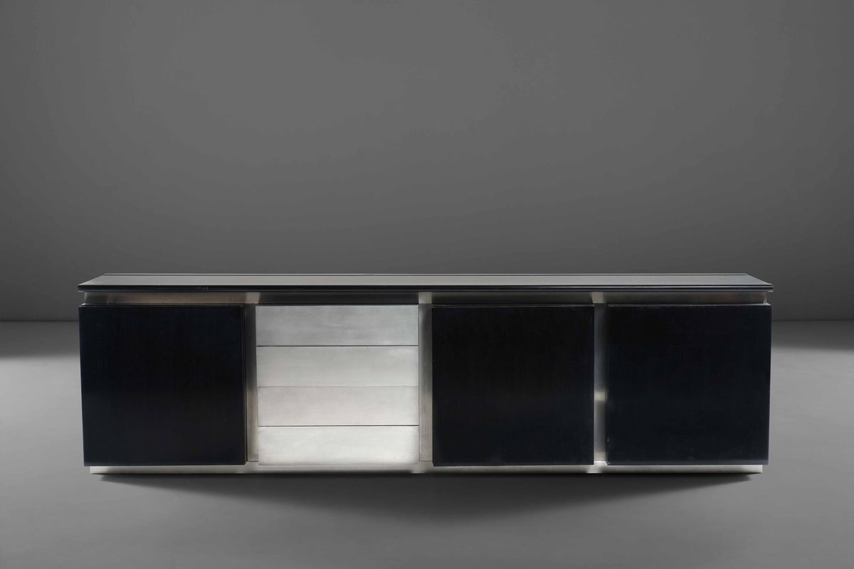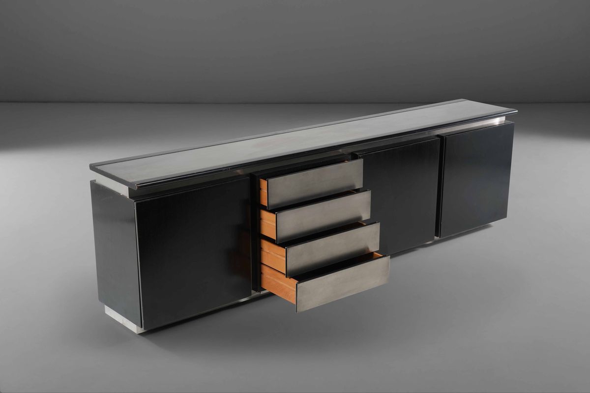 Grande credenza con struttura in legno laccato e alluminio spazzolato.
