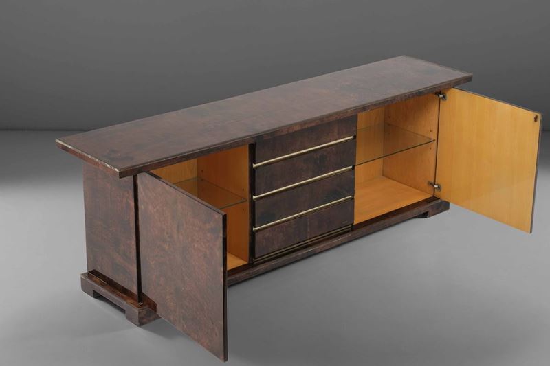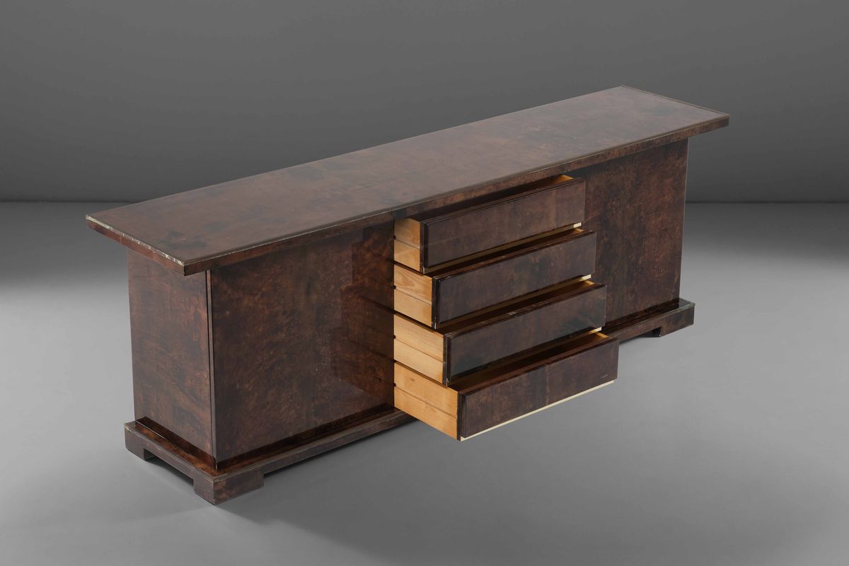 Grande mobile contnitore con struttura in legno e rivestimenti in pergamena.