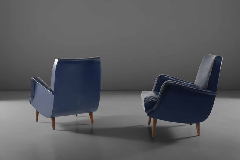 Coppia di poltrone con struttura e sostegni in legno e rivestimenti in skai.