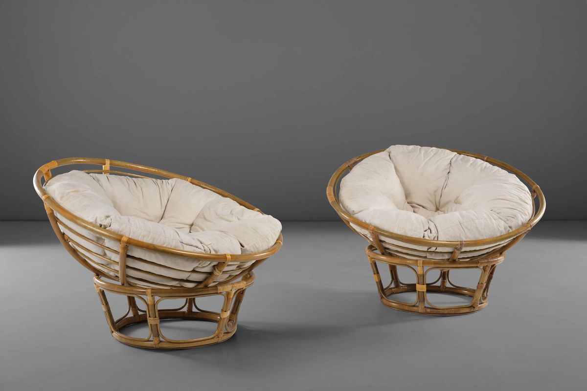 Coppia di poltrone con posizione della seduta regolabile e orientabile su base fissa. Struttura in bamboo e vimini con cuscini rivestiti in tessuto.
