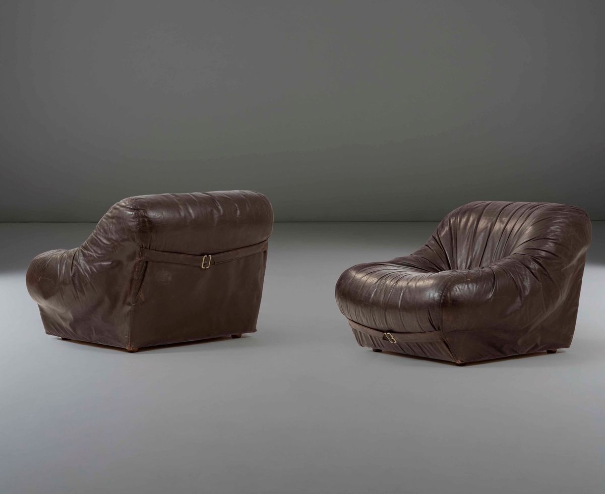 Coppia di poltrone con struttura in legno e rivestimento in pelle.