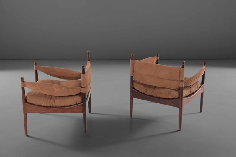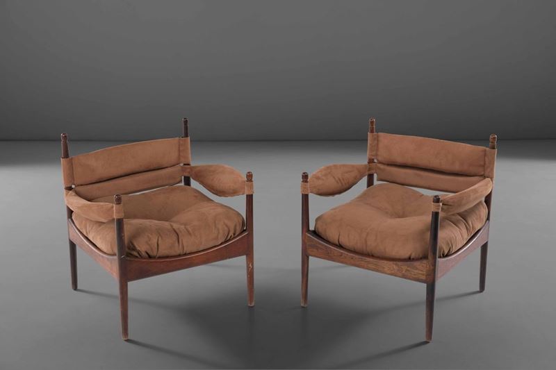 Coppia di poltrone con strutture e sostegni in legno e rivestimenti in tessuto.