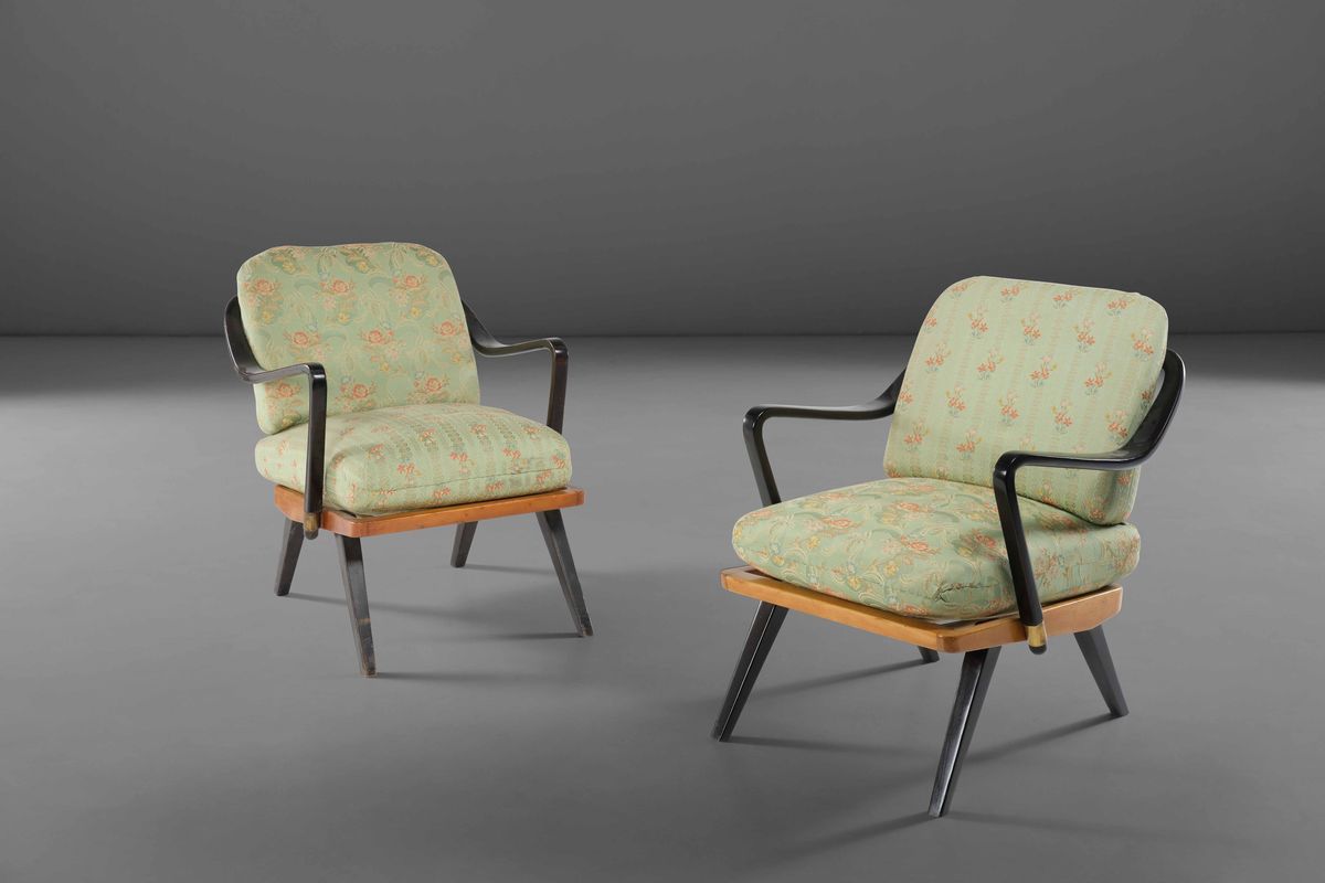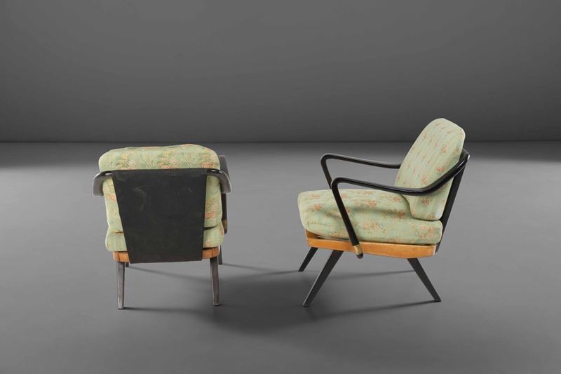 Coppia di poltrone in legno con rivestimento in tessuto.