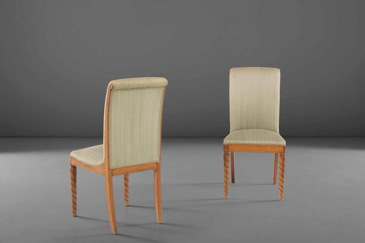 Coppia di sedie con struttura in legno e legno lavorato. Rivestimenti in tessuto.