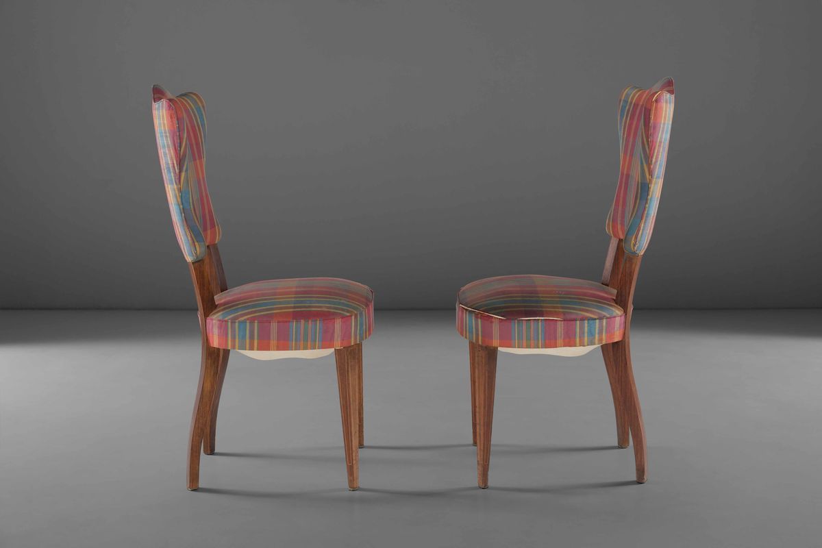 Due sedie in legno con rivestimenti in tessuto.