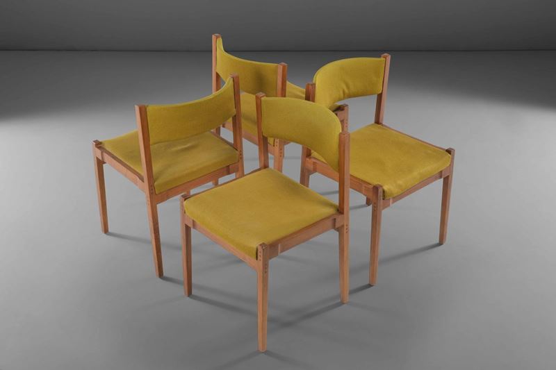 Quattro sedie con struttura in legno e rivestimenti in tessuto.