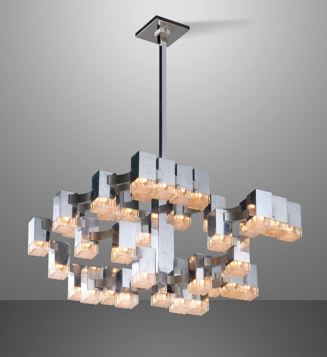 Lampada a sospensione con struttura in metallo cromato. Diffusori in plexiglass.