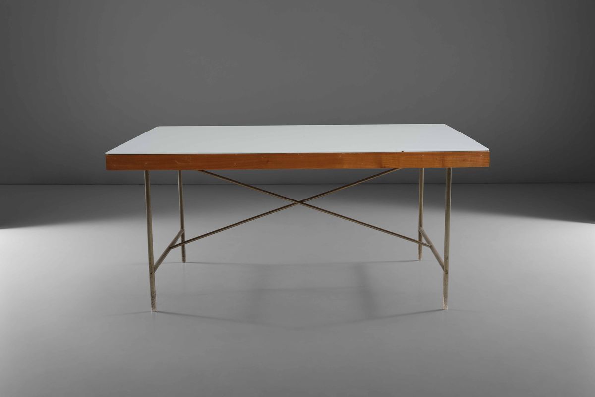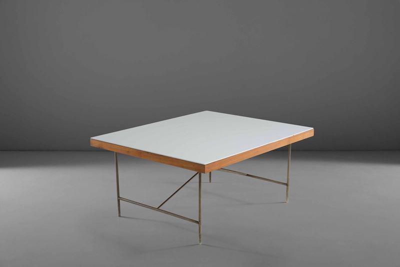 Tavolo basso in legno con piano in pasta di vetro e sostegni in tubolare metallico.