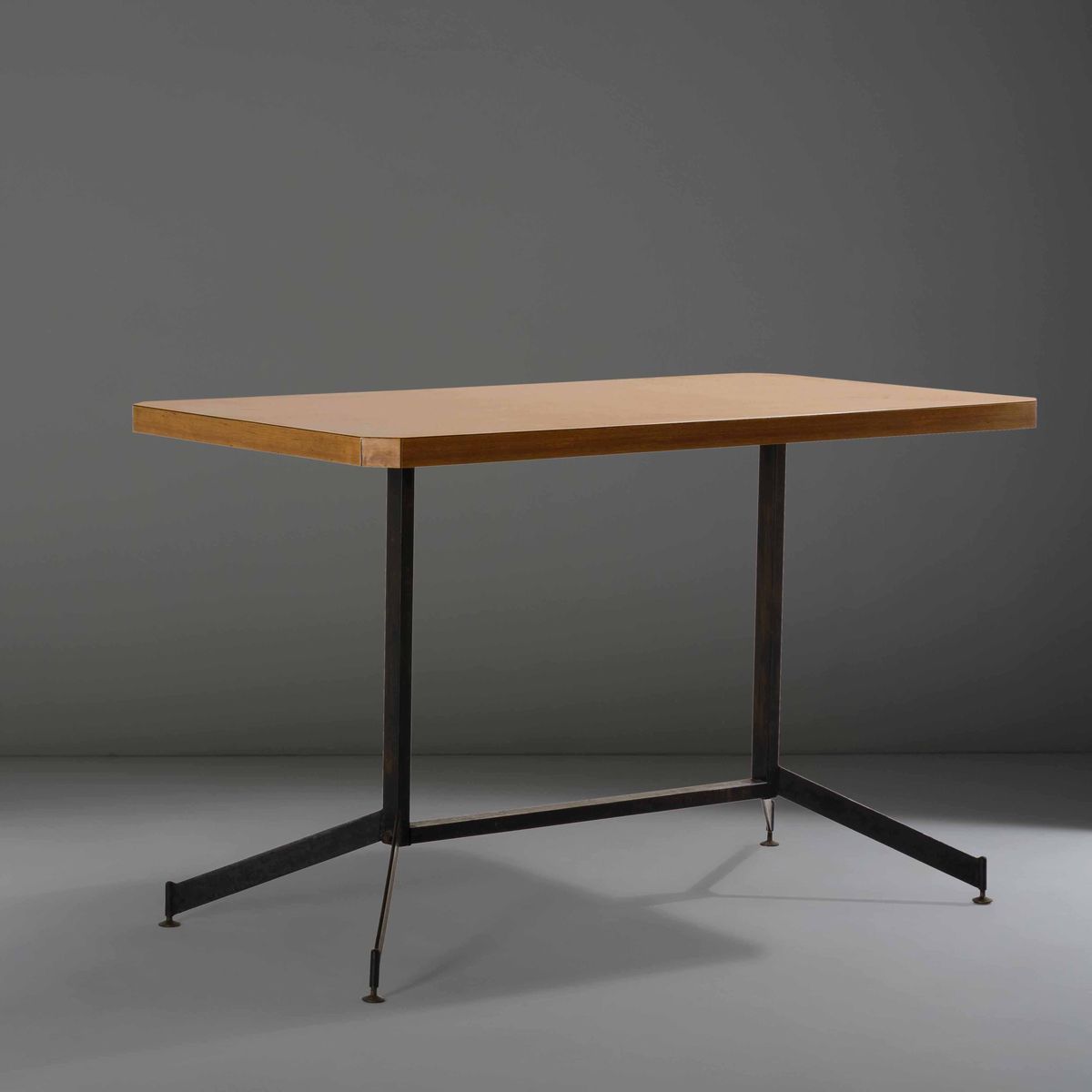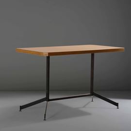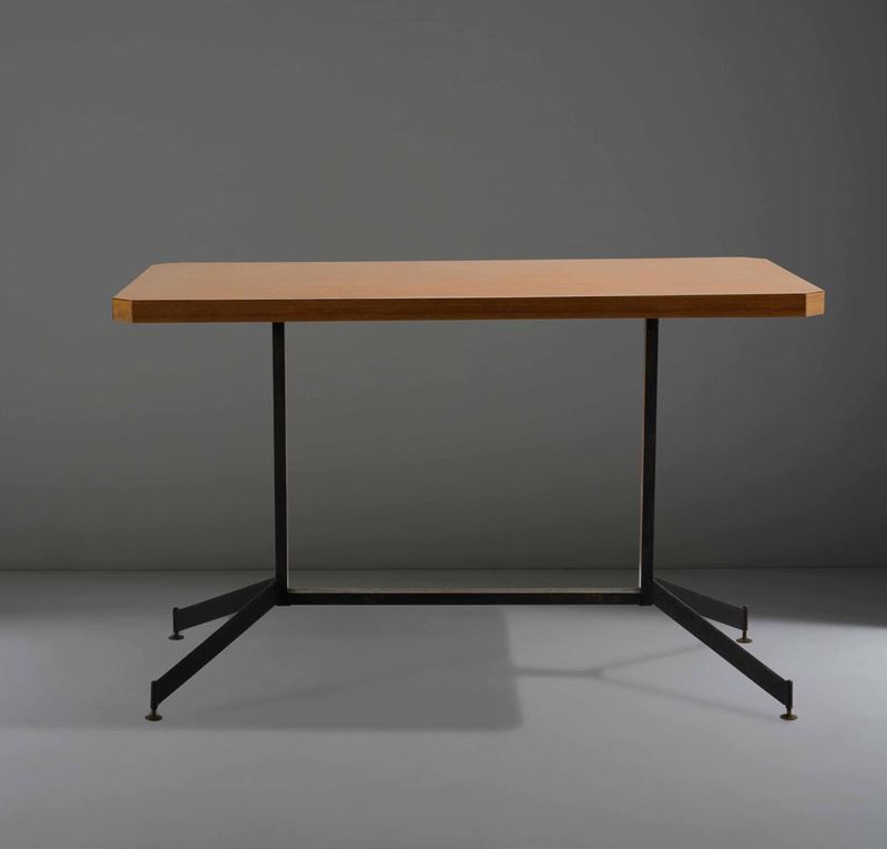 Tavolo con struttura in metallo laccato, particolari in ottone e piano in legno laminato.