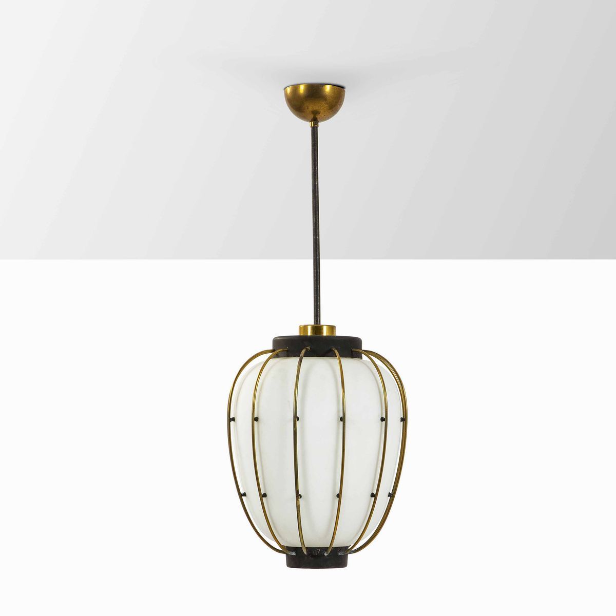 Lampada a sospensione con struttura in ottone e metallo laccato e diffusore in vetro satinato decorato con stecche in ottone.