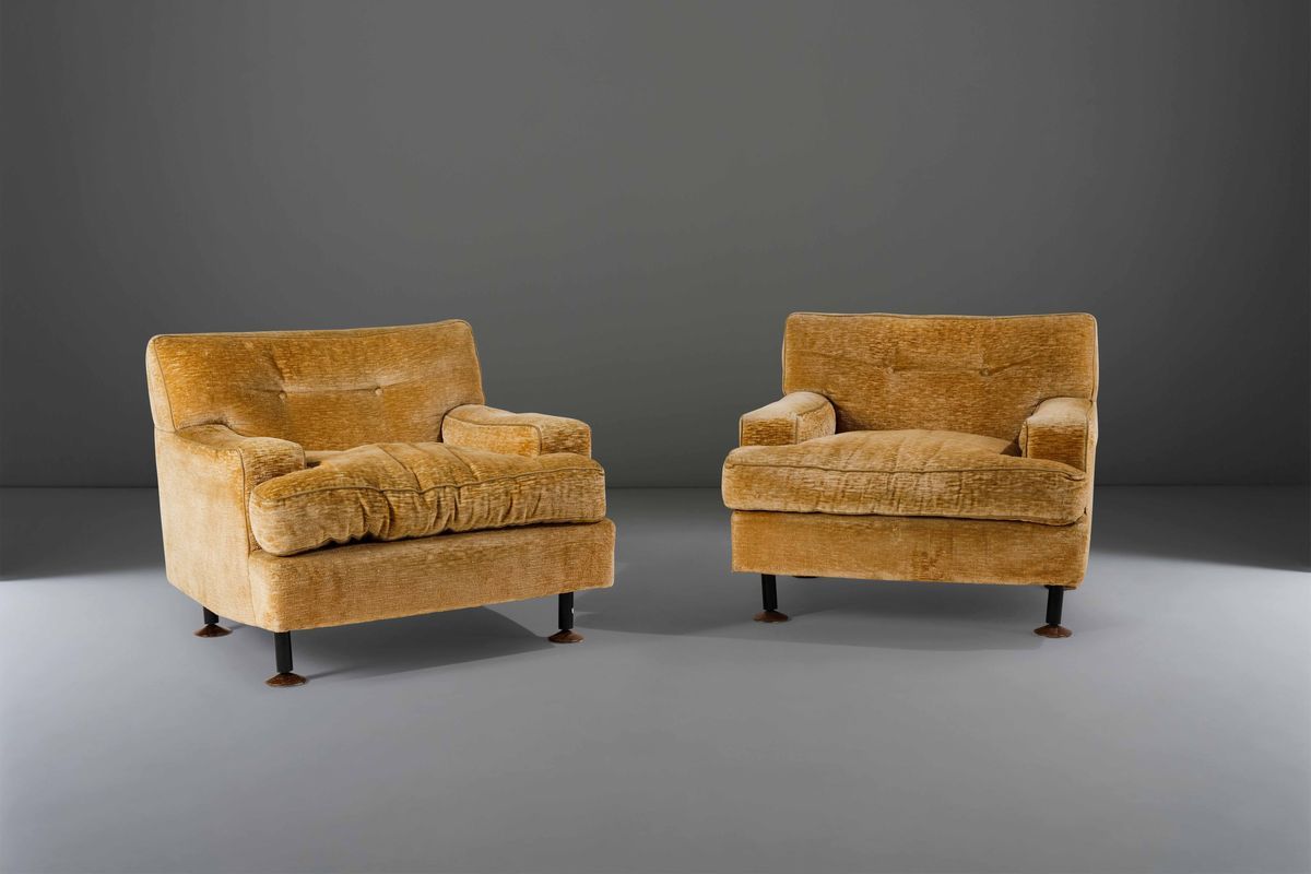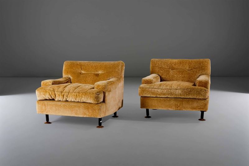 Coppia di poltrone mod. Square con struttura in legno, rivestimenti in tessuto ed elementi in metallo e legno.