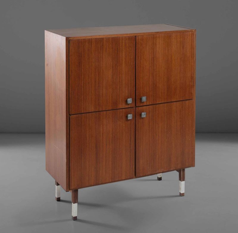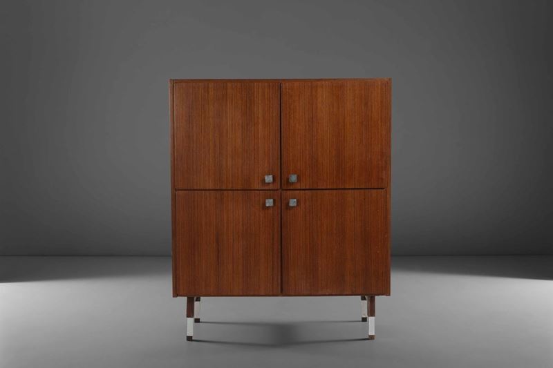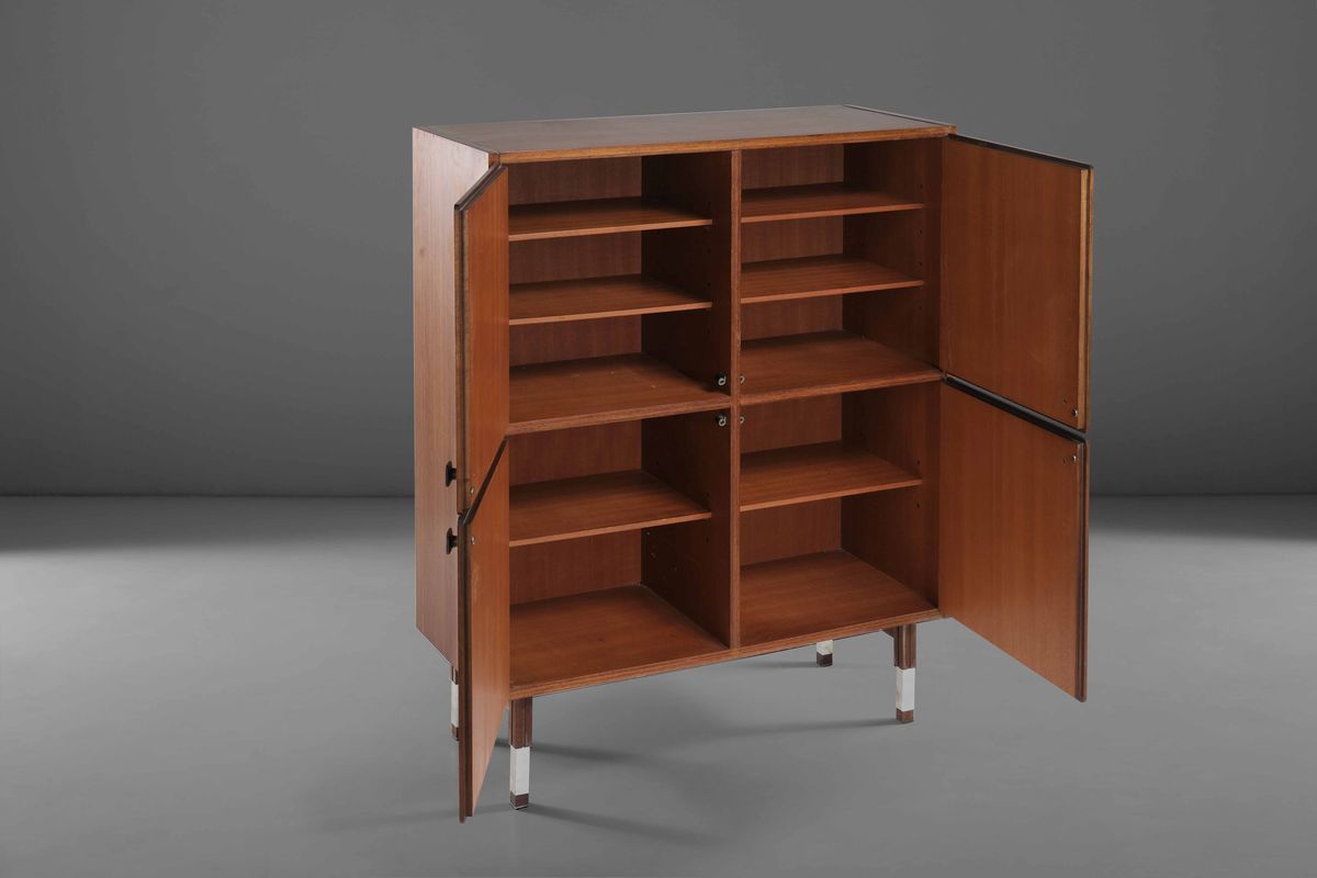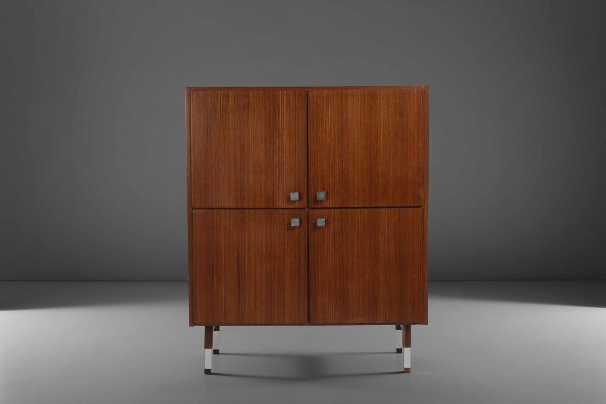 Mobile contenitore con struttura in legno e dettagli in acciaio.