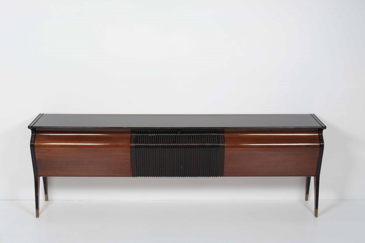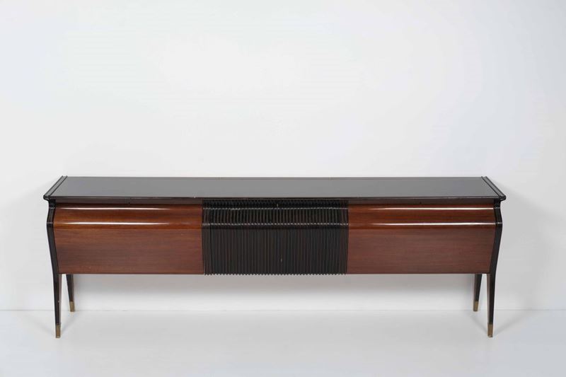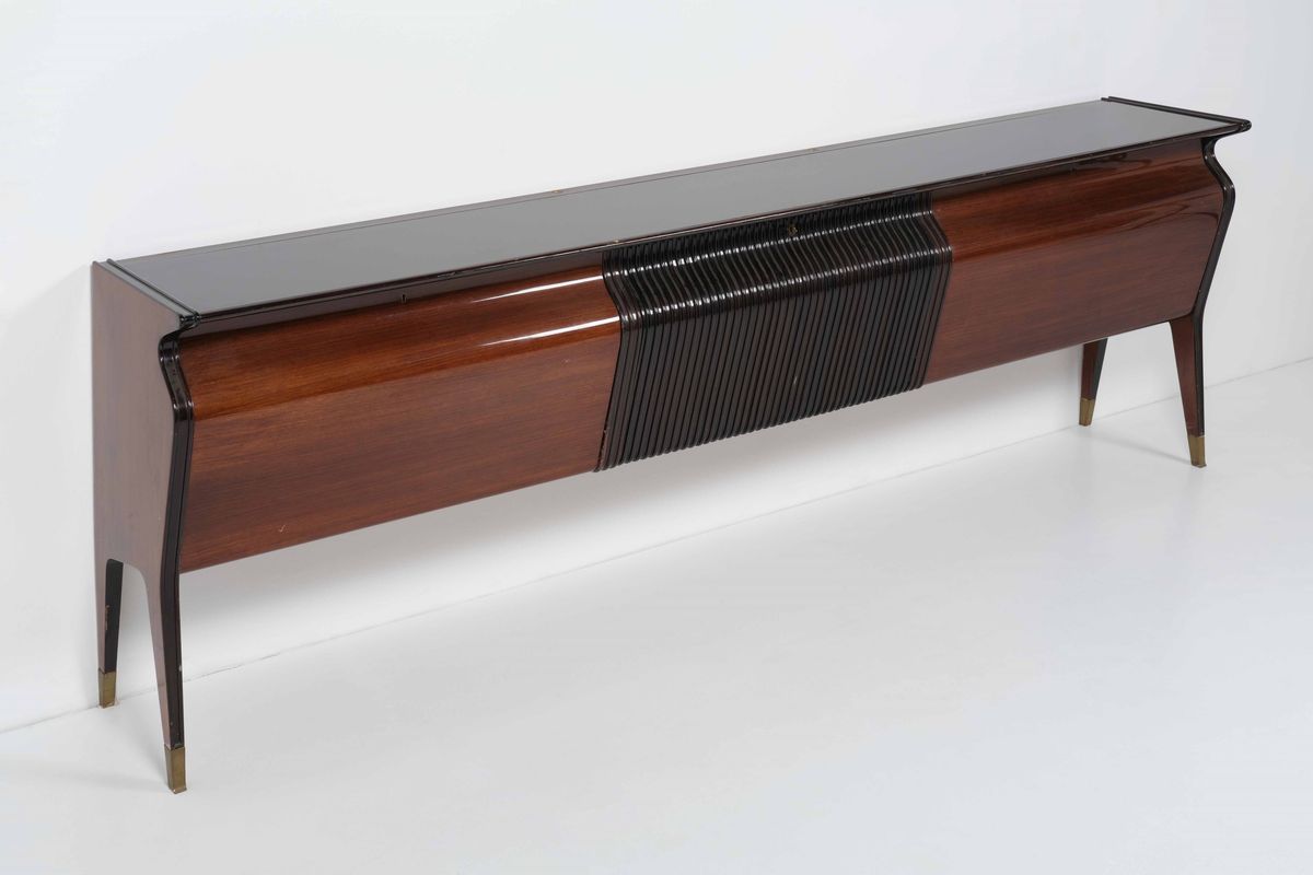 Credenza con struttura in legno e legno grissinato. Piano in vetro e puntali in ottone.